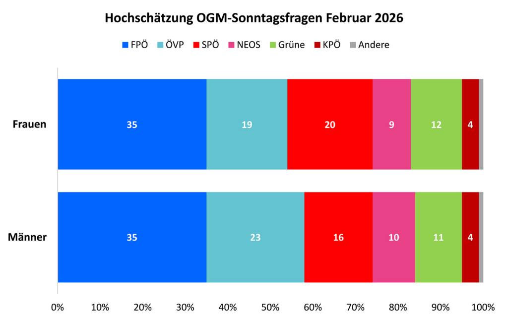 „Frauen wählen links, Männer rechts“ war in den letzten Jahrzehnten eine Standardaussage von Demoskopen, Politologen und Journalisten. Aber er stimmt nach allen Umwälzungen der letzten Jahre nicht mehr. Die Sonntagsfragen von OGM zeigen, dass der „Gender Gap“ im Wahlverhalten weitgehend verschwunden ist.