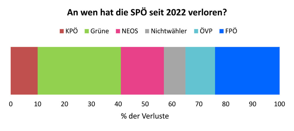 Die SPÖ hat also seit 2022 mehr als 500.000 Wähler eingebüßt, darunter 155.000 an die Grünen, 120.000 an die FPÖ, 80.000 an die NEOS, 55.000 an die ÖVP, 50.000 an die KPÖ und 40.000 an die Nichtwähler.
