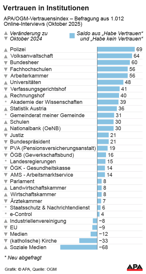 Methodik: Für den Vertrauensindex Institutionen wurden 1.012 repräsentativ ausgewählte österreichische Wahlberechtigte im Oktober 2025 befragt. Max. Schwankungsbreite 3,1%. Die Fragestellung ist seit Beginn des Vertrauensindex seit Jahrzehnten immer gleich und lautet „Vertrauen Sie … oder vertrauen Sie … nicht oder kennen Sie … nicht?“. Der Vertrauenssaldo errechnet sich als Differenz der Prozentwerte „vertraue“ minus „vertraue nicht“. Zuwächse/Verluste im Zeitvergleich sind die Veränderung dieses Saldos gegenüber der letzten Erhebung.